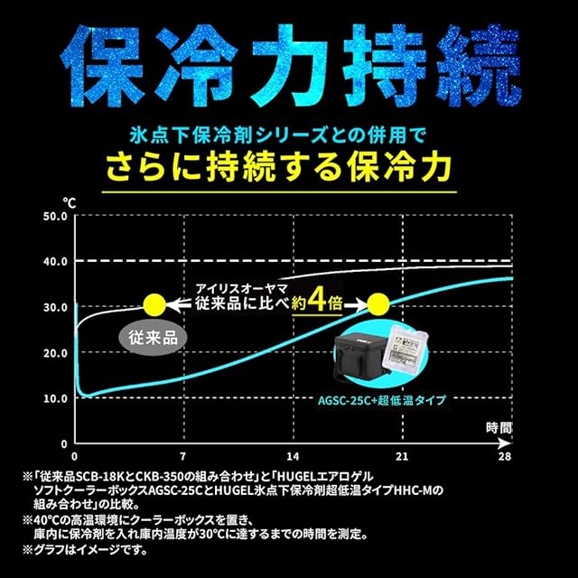 宇宙服にも使用される、高断熱素材“エアロゲル”を使用したソフトクーラーボックス。冷気が逃げにくく、ハードタイプに負けない保冷力。最大保冷時間:約5.1日(※)。(※本体容量40%相当の氷を入れ、底面温度が8℃に達するまでの時間。環境温度:30℃→9時間・20℃→15時間の繰返し。)