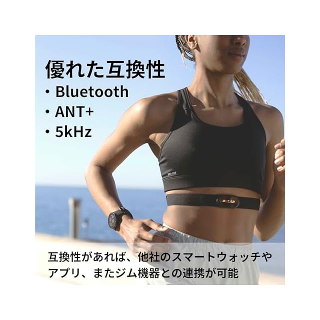 主な機能:心電による心拍計測Bluetoothでの2台同時接続、BluetoothとANT+による多様なデバイスに接続、5kHzトレーニング機器との互換性、耐水30WR