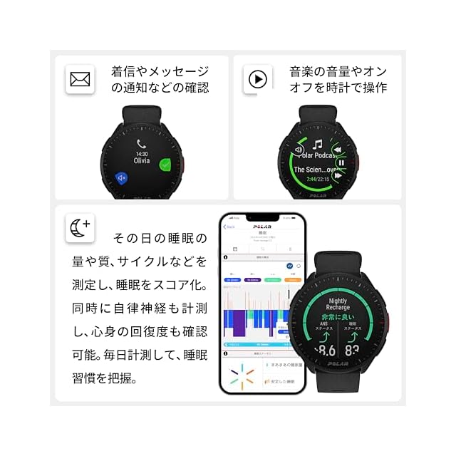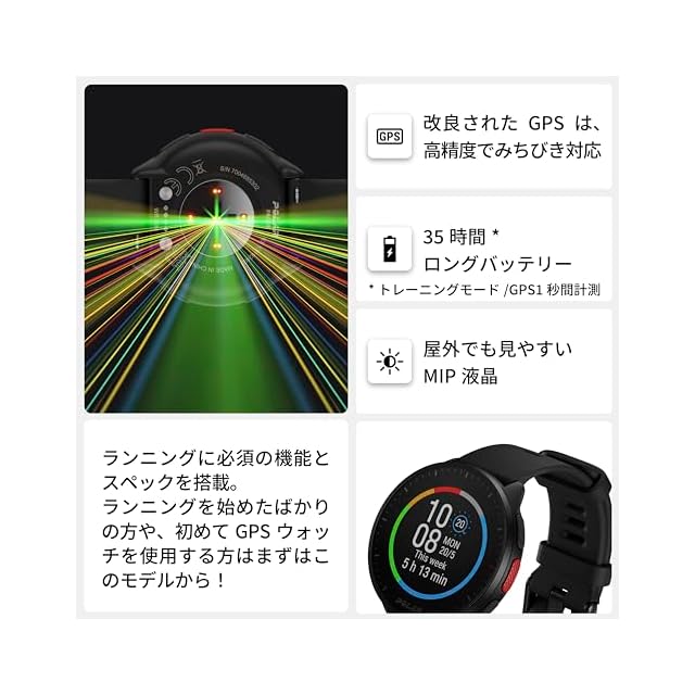 主な機能:手首型心拍計測、GPS(みちびき対応)、オート/マニュアル ラップ計測、ランニング/ウォーキングテスト、三大栄養素別で消費エネルギーを表示、栄養補給リマインダー、活動量計測(歩数・距離・消費カロリー等)、睡眠・自律神経計測、スマート通知(着信・通知)、音楽コントロール、天気予報、 耐水50WR