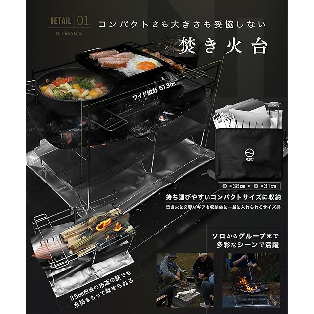 ZEN Campsが開発に一年以上かけて誕生した地面への遮熱を考えた自然を傷つけない焚き火台「NT Fire Stand」です。自然を傷付けない事を一番に考えた設計で焚き火をするための火床に加え、焚き火からの放射熱をカットする「遮熱板 兼 灰受け」を装着する設計となっています。コンパクトですがフレームを展開すると51cmほどの幅があるので、焚き火も料理も楽しめます。