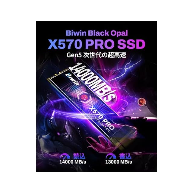 【Biwin X570 PRO】Biwin X570 PROは、究極の高速を求めるパワーユーザー向けに設計された第5世代M.2 SSDです。従来のGen4 SSDと比較して、最大2.5倍の読み取り速度と最大5倍の書き込み速度を実現。ゲーミング、コンテンツ制作、AIトレーニングなど、負荷の高い作業においてもデータ転送のボトルネックを解消し、システム全体の性能を最大限に引き出します。