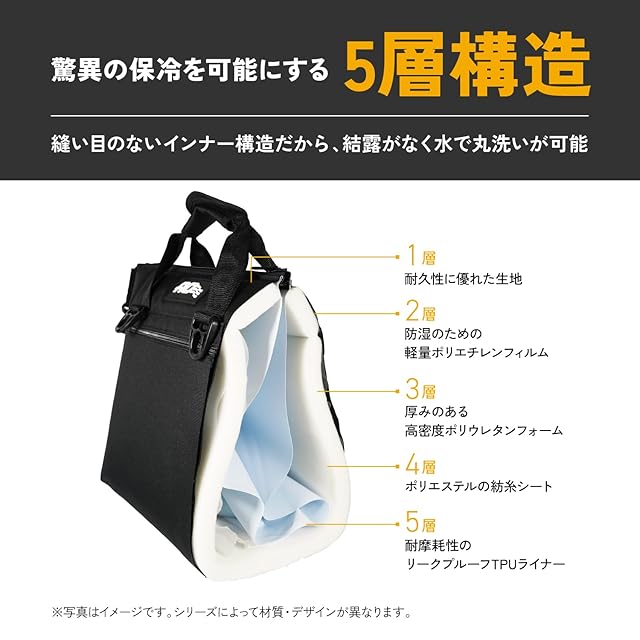 ■素材はウォーターベッドや地面に設置するポールなどにも使われている素材と同じ高品質なビニールライナーを採用。■内部の断熱材は厚み1.9cm、高密度の独立気泡フォームを使用しています。この素材の組み合わせにより、サイズによっては氷なら外気温49℃の中で約24時間維持できる程、驚異の保冷力を発揮します。■縫い目のないシームレス構造。高品質溶接TPUライナーでインナーからの水漏れを防ぎます。冷気が逃げず保冷力を高めます。