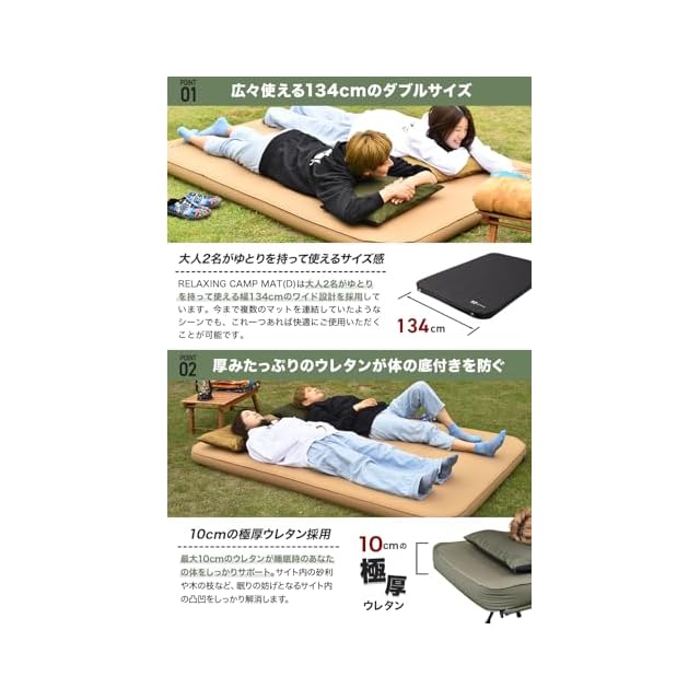 【キャンプでも睡眠を妥協したくないあなたへ】クッション素材には弾力性に優れているウレタンを使用。さらにひし形から横方向に打ち抜き方向を変更することでエアーによるマットの張りを損なわずウレタンの気持ちいい弾力を実現!【2人でたっぷり使えるワイド設計!】リラクシング キャンプマット ダブルサイズ は大人2名がゆとりをもって使用できるサイズ感です。幅134cmに設計することで、従来のマットにありがちだった寝返りの歯肉さを解消しています。