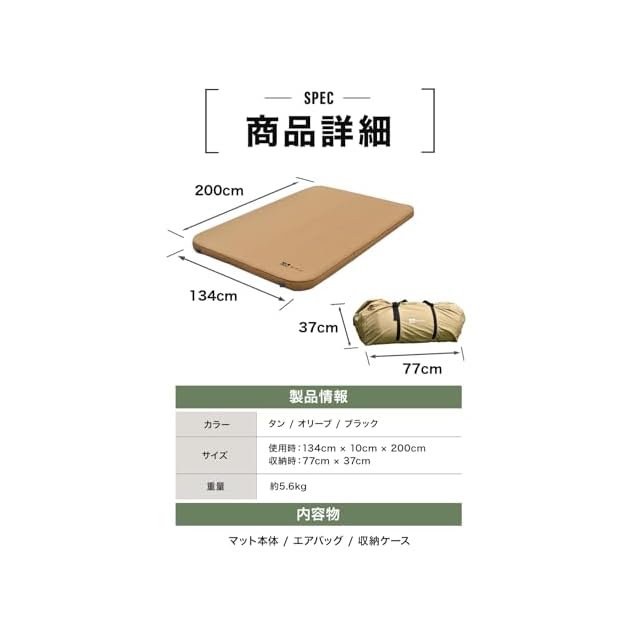 人気のアウトドアブランド【WAQ】からさらに寝心地が抜群の10cm 厚手の 車中泊・キャンプマットが登場!アウトドアに必需品の車中泊マット マットレス エアーマット!ウレタンマット!【キャンプでも睡眠を妥協したくないあなたへ】クッション素材には弾力性に優れているウレタンを使用。さらにひし形から横方向に打ち抜き方向を変更することでエアーによるマットの張りを損なわずウレタンの気持ちいい弾力を実現!【2人でたっぷり使えるワイド設計!】リラクシング キャンプマット ダブルサイズ は大人2名がゆとりをもって使用できるサイズ感です。幅134cmに設計することで、従来のマットにありがちだった寝返りの歯肉さを解消しています。【厚みたっぷりのウレタン】最大10cmの極厚ウレタンがあなたの体をしっかりサポート。弾力性のある生地と相まって寝心地が更に向上いたしました。【自動膨張】バルブを開くと自動で空気が入ります!さらに高機能バルブを搭載した事で空気の逆流を防ぎ、より効率よく空気を取り込むことが可能に。 ※初回空気入れ時は出荷状態のため空気の入りが遅く、約10~15分ほどかかります。【睡眠の妨害をシャットアウト】マット厚10cmで車内の段差や地面のデコボコを解消!気になる底つき感もなく冬の地面からの冷気もシャットアウトしてくれるので快適な睡眠を確保できます!また コット との相性も抜群です!キャンプマットとしても使えます!