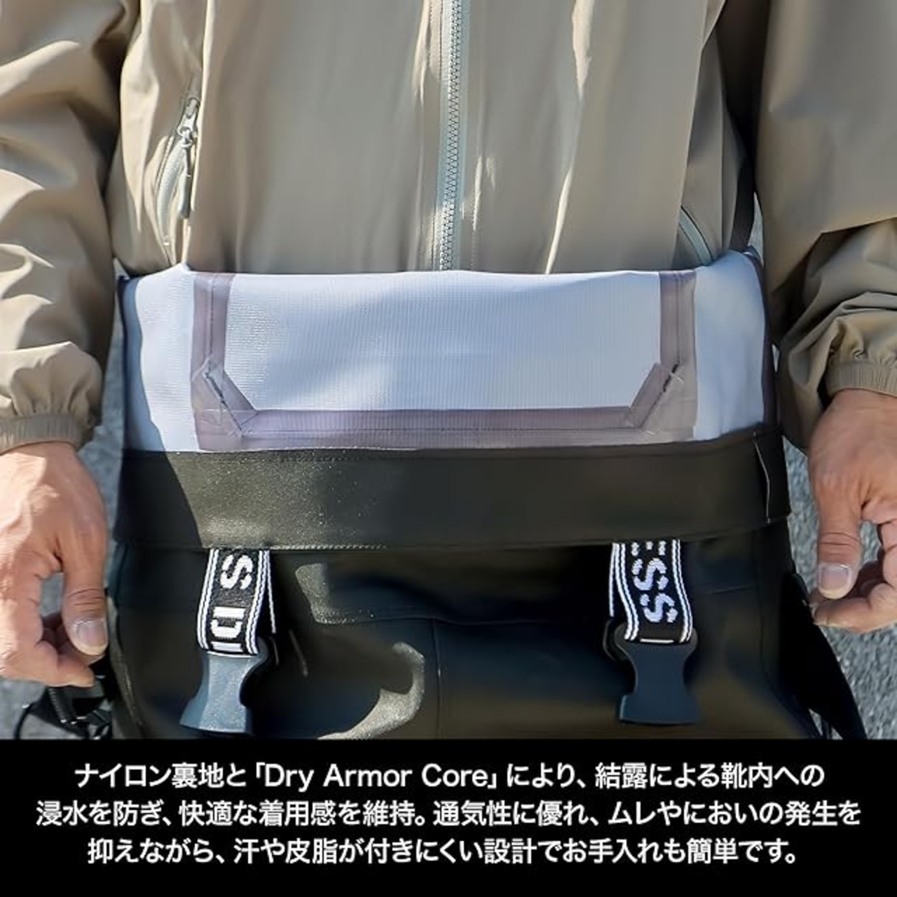 裏地【Dry Armor Core】 吸湿速乾素材を採用し、耐久性と快適性を兼ね備えた設計です。汗や結露を効果的に吸収し、蒸れを防ぎ、常に快適な状態を維持します。また、インナーのレイヤード次第でオールシーズン快適に釣行を楽しむことが可能です。 ・高温の季節: 接触冷感タイツなどのインナーを着用することで、より快適に釣行を楽しめます。 ・低水温の季節: 保温性の高いインナーを選ぶことで体温を維持し、暖かさを保てます。