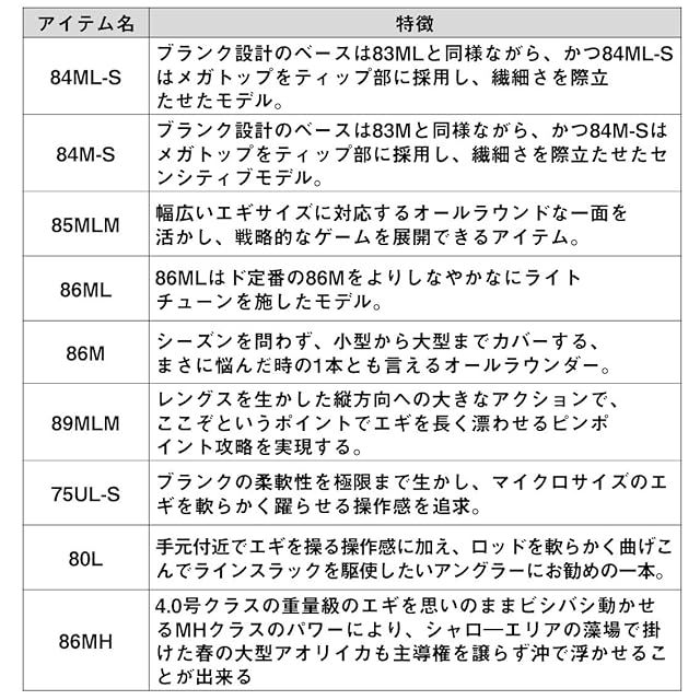 【仕舞(cm)】117 , 【先径/元径(mm)】0.9/8.9 , 【エギサイズ(号)】1.5~3.0
