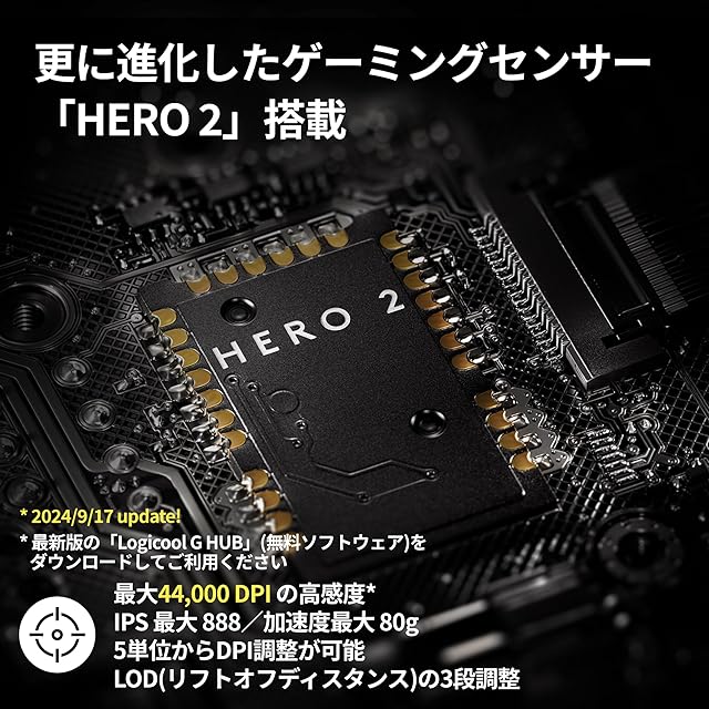 世界で一番多くプロゲーマーに使用されてきたHERO センサーを更に強化/5単位からDPIの調整が可能/LOD(リフトオフディスタンス)の3段調整/DPIも44000まで増加/より細かいニーズに合わせた設定が可能