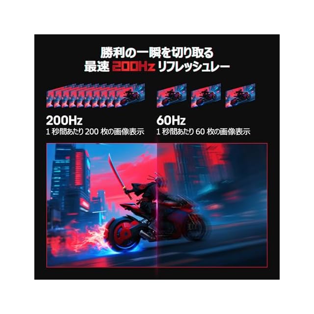 【200Hz高リフレッシュレート・1ms応答速度】最大200Hzリフレッシュレートに対応でき、1秒間あたり200枚の画像表示と1ms高速応答速度で、FPSや格闘ゲームの高速動作もなめらかに再現、より滑らかでスムーズな映像をお楽しめます。Adaptive Syncテクノロジーも対応(FreeSync&G-Sync対応)で、画面のティアリングやスタッタリングを解消できて、ゲーミングモニターとして圧倒的なゲームプレイを与えられます。