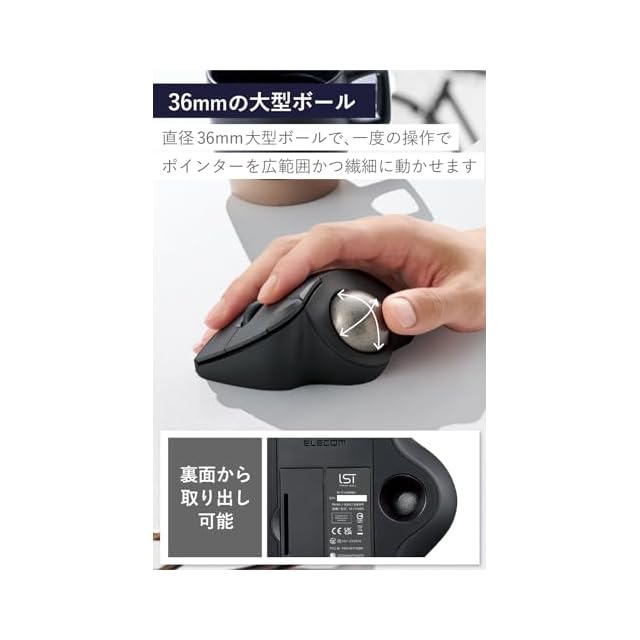 親指にフィットする直径36mm大型ボールを採用し、一度の操作でポインターを広範囲かつ繊細に動かせます。