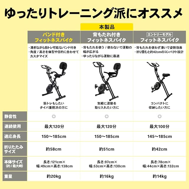 2024年9月にモデルチェンジしたこのエアロバイク フィットネスバイク 家庭用 静音は、機能性、収納性、デザイン性のすべてにおいてお客様の声を反映し、進化を遂げました。常にそばに置いておくことで運動を継続しやすくなるエアロバイクとして、インテリアに調和するデザイン性と、置いても圧迫感がないコンパクトな収納性にこだわりました。使わないときは簡単に折りたたみが可能です。また、成長が数字で見えるモニターは5項目を常に表示し、さらに見やすくなりました。続けにくい有酸素運動を無理せず楽しく続けられるように後押しするエアロバイク 家庭用 フィットネスバイクの登場です。背もたれを使う / 使わないで運動の幅が広がり、軽めの運動不足解消から有酸素運動まで、幅広いバイクフィットネスに対応。サドルの幅と厚さも日本人の体形に適しているため、長時間のトレーニングでもお尻の痛みや疲れを感じにくくなっています。ブレーキパッドには独自の非接触式(磁気式)のairホイールを採用し、稼働時の摩擦を排除。図書館より静かな40dB以下の稼働音で、最大120分の連続ライディングが可能です。摩擦熱による部品の劣化が起こりにくいため、特別なメンテナンスは不要なエアロバイク 家庭用 静音です。モーター部分をスリムに設計し、広げたときは新聞見開きサイズ(奥行き約72cm)のコンパクトさを実現。折りたたみはピンを引くだけのお手軽ワンタッチ式で、キャスター付きなので屋内の移動も簡単です。付属のモニターには走行距離、スピード、走行時間、カロリー、心拍数の計5項目が同時に表示され、運動状態を常に把握することができます。最大心拍数40〜60%で有酸素運動をすると脂肪燃焼が促され、スタイルアップ効果が見込めるフィットネスバイクです。初心者でも簡単に組立てができ、取扱説明書や組立て解説動画もYouTubeにて公開中。レバーをひねるだけで16段階の負荷調整が可能で、サドルの高さは7段階で調整可能、適応身長は155cm〜185cmです。ペダルのベルトは足のサイズに合わせて6段階に調節でき、しっかりとした固定感を実現。目的や体力に合った強度のトレーニングが可能な家庭用エアロバイクです。モニター付近にはタブレットホルダーを設置しており、動画、電子書籍、SNS、通話などを楽しみながらトレーニングが可能。長時間の利用に最適なエアロバイク 家庭用 静音として、室内自転車トレーニングに最適なフィットネスバイクです。