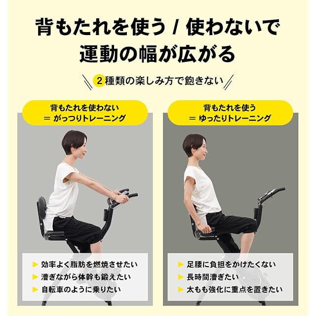 【背もたれを使う / 使わないで運動の幅が広がる】2通りの楽しみ方ができるので、軽めの運動不足解消から本格的なエアロバイクトレーニングまで、幅広い運動・トレーニング・バイクフィットネスに対応。自宅で気軽に使える家庭用エアロバイクとして、初心者から上級者まで快適に使用できます。サドルの幅と厚さも日本人の体形に適しており、長時間のフィットネスバイクトレーニングでもお尻の痛みや疲れを感じにくい設計。また、静音設計のエアロバイクなので、早朝や夜間のトレーニングでも周囲を気にせず使用できます。この家庭用フィットネスバイクは、背もたれを活用することでリラックスしながらのトレーニングが可能。負荷を調整しながら、自分に合った静音エアロバイクの使い方を見つけられます。