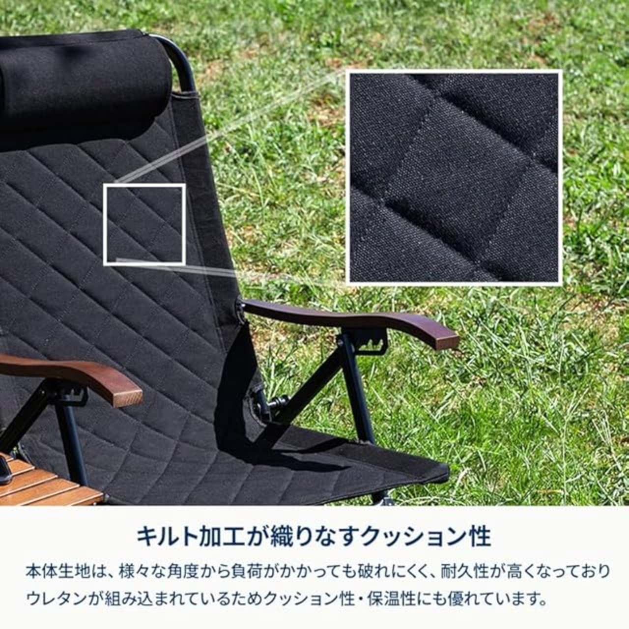 ●4段階でリクライニングが可能。ずっと座っていたくなる、快適チェア。<br><br>●人間が可能な限り自然な動きや状態で使えるよう設計したひじ掛け<br><br>●高さの調節可能な枕付き<br><br>●クッション性、防寒性をUPするキルト加工<br><br>●肌当たりの良いコットン素材を採用<br><br>●【アウトドアチェア】【キャンプチェア】【キャンピングチェア】【ガーデンチェア】【コンパクトチェア】【イス】【折りたたみ椅子】【ローチェア】【ロータイプ】【ロースタイル】【おしゃれ】【コンパクト】【軽量】【持ち運び】【リクライニング】【コットン】【キルト】【枕付き】【キャンプ椅子】【リクライニングチェア】