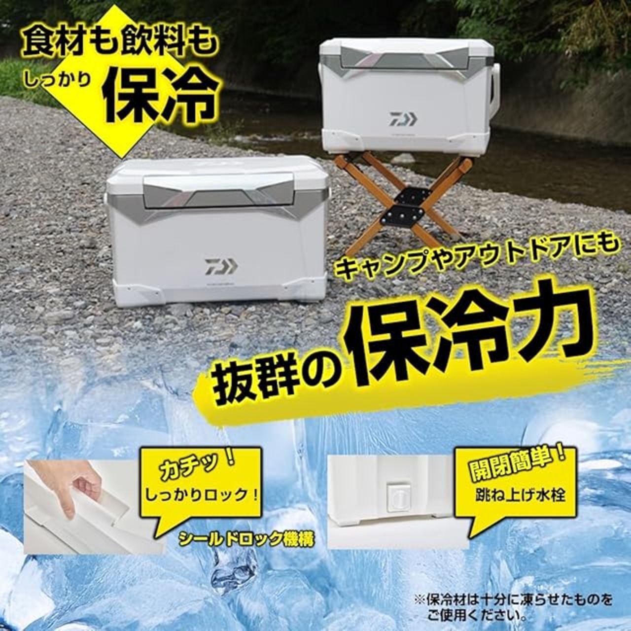 更に剛性がアップした座れる頑丈「マッスルボディ」 開閉便利なワンハンドオープン、取り外し可能でお手入れ簡単な両開き上フタ 新機構の「シールドロック機構」は押し込むだけで密閉性がアップするので安心 90度まわすだけで開閉簡単、手が汚れにくい跳ね上げ水栓付き クーラー内の水を素早く排水するΦ24大口径水栓