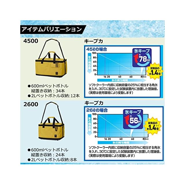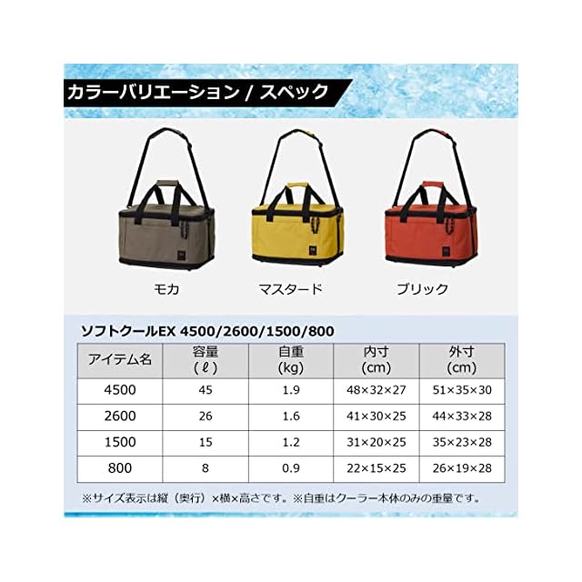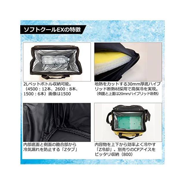 7層断熱構造を採用して保冷力を強化(断熱部は従来ソフトクールは発泡ポリエチレンのみ、EXは発泡ポリエチレン+発泡ウレタン)。 用途に合わせて選べる4サイズ、各3色展開。