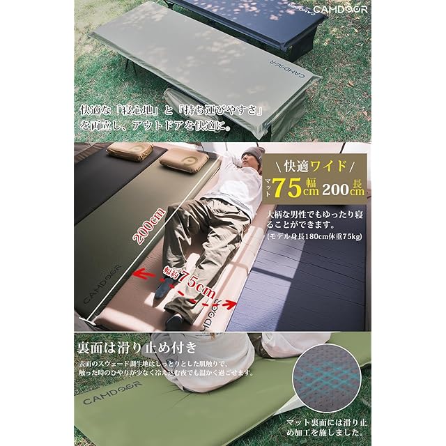 商品名:CAMDOOR キャンプ エアーマット 【30秒自動膨張・超広幅75cm】インフレーターマット 10cm/8cm インフ マット R値 6.8 自動膨張 車中泊 キャンプ用品 厚手 寝具エアーベッド 防水防潮 安全無臭 持ち運び便利 簡単収納 収納袋付き 2個セット