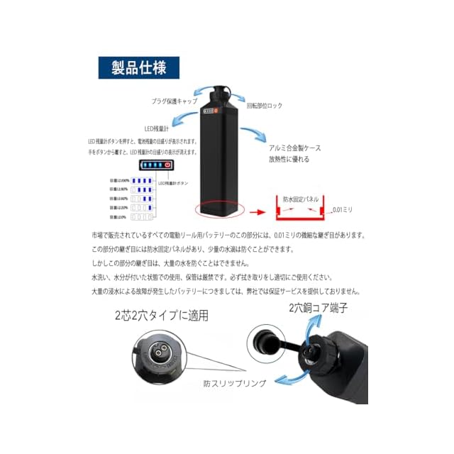 全魚種電動リール専用バッテリー対応、2芯電動リールに適用されます。6芯電動リールには適しません。<br> 【セット内容】9000mAhバッテリー*1、充電器*1、2メート2芯延長コード*1、収納バッグ*1、日本語取扱説明書。<br> 2mの延長ケーブルは充電器に直接接続して充電できます。<br> 取扱説明書は収納バッグに入っています。<br> LEDライトをランダムにプレゼントする。<br> 出荷品はテスト後に出荷します。<br><br> 電池残量が一目でわかるLED機能を搭載し、LED残量計のボタンを押すと、バッテリー残量の目盛りが表示されます。<br> ごく一部のバッテリー側のコードが抜けない場合は、弊社までご連絡ください。弊社は新しいバッテリーとコードを無料で交換します。コードが抜けにくくなるのを防ぐため、締める際に力を入れる必要はありません。<br> バッテリーの残量が少なくなると、電圧低下によって電動リールの巻き上げスピードや強さに変化が起こったり、接続機器の動作に変化が起こる場合がございます。<br> 太りすぎの魚を釣ると、バッテリーが過負荷になり、電源が自動的に遮断されます。電源が遮断され場合は、バッテリーを取り外して電動リールに再接続してから、作業がまた始まります。<br> ごく一部の電動リールの糸巻き防止機能がはたらきモーターが回らなかったが、糸を10m出してから使用するとモーターが回りました。<br> 魚探の電源としても使えるのでばっちりです。