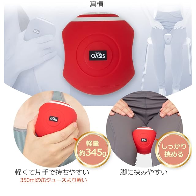椅子に座ったままでできる 挟んでスイッチ入れるだけ 隙間時間でいつでもできる 脚に挟みやすくすることで最大限の運動量UP! また、使いご心地にもこだわり、内ももで無理なく挟めて内転筋~お腹周りまでの連動性が高まる大きさに設計 シニアにも片手で持てるように重量は350ml の缶ジュースより軽い約345gとなっています