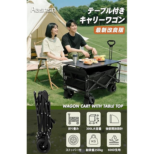 Aasnsn キャリーワゴン 【300L大容量 長物対応 後部展開可 耐荷重250kg】 キャリーカート テーブル付き ボトルポケット付き アウトドアワゴン キャンプ 折りたたみ ワンタッチ収束式 軽量 静音 キャンプ・引越し・BBQ・買い物・釣り・ゴミ出し・運動会 ブラック(テーブル付き) | LIS MART