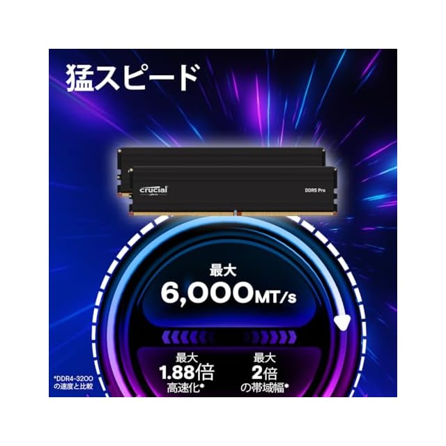 CrucialのDDR5 Proデスクトップモジュール32GBキット(16GBx2)で、データ転送速度6,000MT/秒