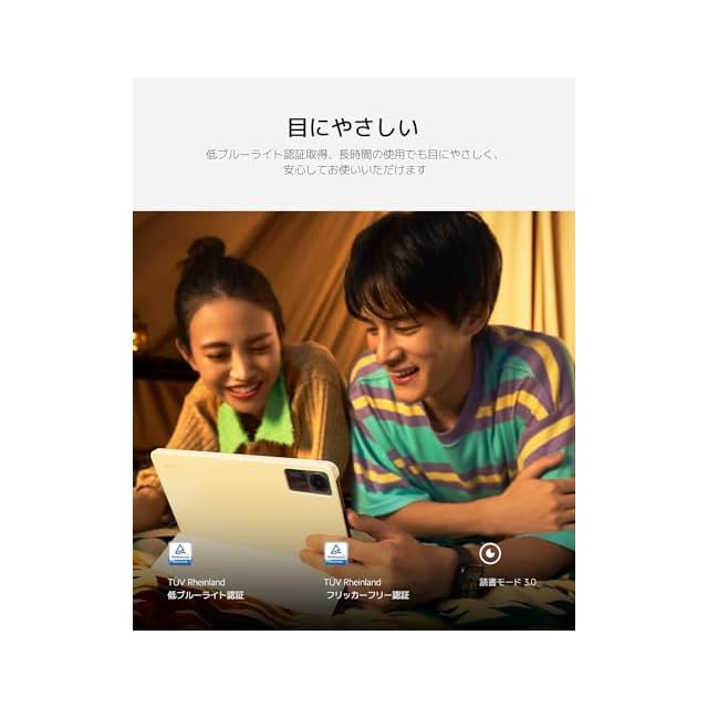 【スムーズな操作感】1,670万色で、最大90Hz まで自動調整されるリフレッシュレートに対応した大型11インチ フルHD+ ディスプレイが、毎日のエンタメをより鮮やかに、よりスムーズにし、すばらしいビジュアル体験をお届けします。また、TÜV Rheinland 低ブルーライト認証とTÜV Rheinland フリッカーフリー認証を取得しているため、長時間の使用でも目にやさしく、安心してお使いいただけます。