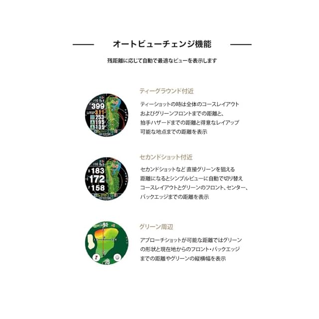 【オートビューチェンジ】残距離に応じて自動で最適なビューを表示。ティーショット、セカンド、アプローチ時。※手動で上下のスワイプ操作を行うことで、切替も可能。