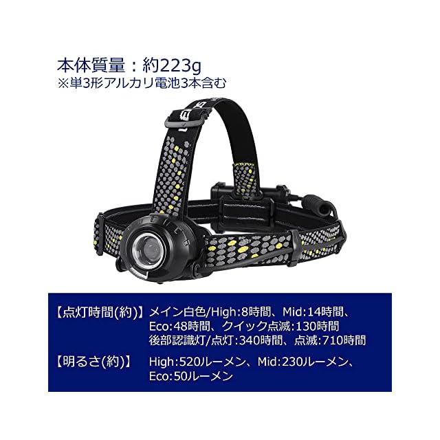 明るさ:High/520ルーメン、Mid/230ルーメン、Eco/50ルーメン、使用電池:単3形アルカリ電池×3本 または 専用充電池(別売り)