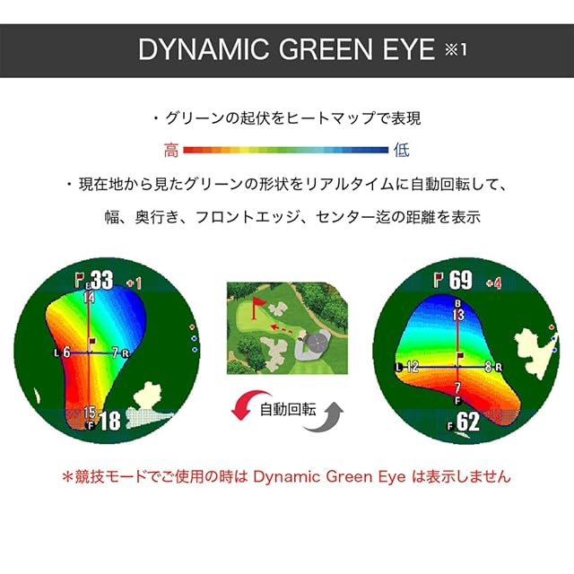 【Dynamic Green Eye】グリーンの起伏をヒートマップで表示。現在地から見たグリーンの形状をリアルタイムに自動回転して、幅、奥行き、フロントエッジ、センター迄の距離も同時に表示