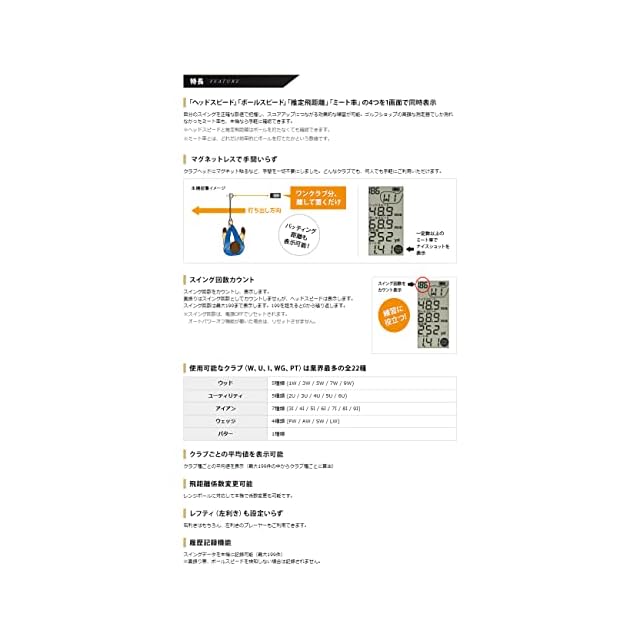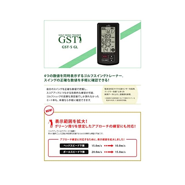 スルガオンラインでの累計販売台数は80,000台を突破!「ヘッドスピード」「ボールスピード」「推定飛距離」「ミート率」4つを1画面で同時表示。GST-3Gからの変更点は、表示範囲の拡大でアプローチの練習に対応。ヘッドスピード下限…15.0m/s→10.0m/s、ボールスピード下限…20.0m/s→15.0m/sに変更されました。スイング回数のカウントも可能になりました。これらパワーアップした点は上位機種にも搭載されている機能です。左利きにも対応!単4形アルカリ乾電池4本使用。コンペ景品、プレゼントにも最適!同系統のGST-5Wよりも安くおすすめです(バッテリーが充電式か電池式か、SDカードスロットがあるかないかの違いのみ)。