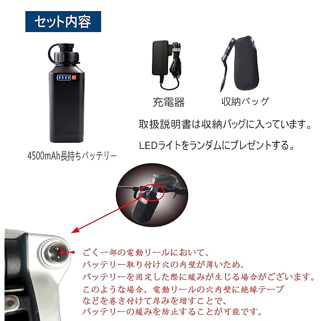 【セット内容】4500mAh長持ちバッテリー*1、充電器*1、収納バッグ*1、日本語取扱説明書*1。取扱説明書は収納バッグに入っています。バッテリーが海に落ちるのを防ぐために、収納バッグにある丸いボタンを釣り竿に固定することができます。差し込みの経は2芯2孔であれば適用できます。