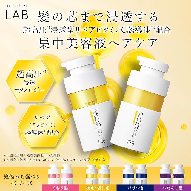 スキンケアで培われたアンレーベルの超高圧※浸透テクノロジーで 枝毛・切れ毛、カラーダメージに集中アプローチ。 さらっとまとまるツヤ髪へ。 超高圧※浸透型リペアビタミンC誘導体*配合 集中美容液ヘアトリートメント 爽やかな甘さの中に透明感が広がるフローラルカシスの香り。 ※超高圧加工処理装置を用いた原料 *テトラヘキシルデカン酸アスコルビル(保湿・補修成分)