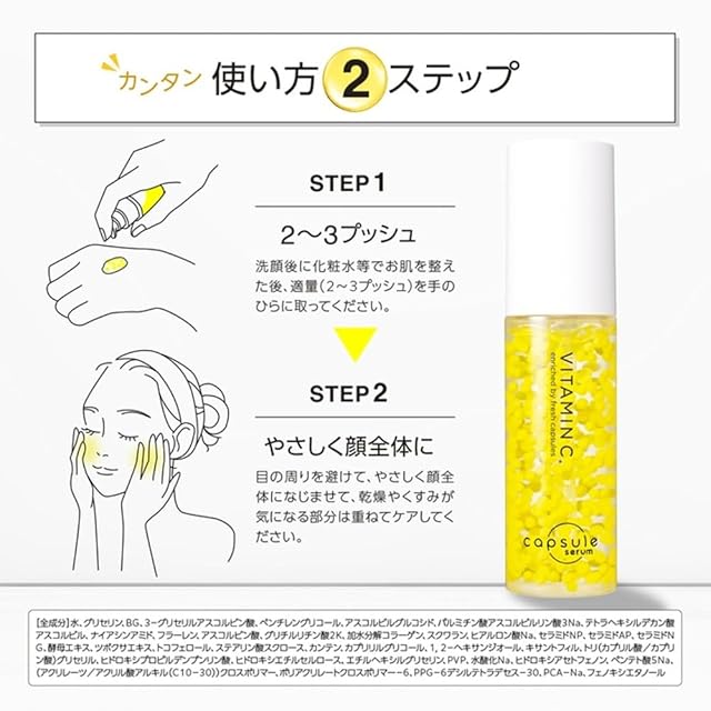 ブランド名:カプセルセラム(CAPSULE SERUM) はじけてうまれる、生美容液。 ー独自カプセルが、成分本来のチカラを引き出す新・美容液ー ①生ビタミンC※1×ビタミンC誘導体※2のWビタミンC処方 ②4種類のビタミンC誘導体を厳選配合 ③浸透型※3ビタミンC誘導体※2がさまざまな肌悩みに多角的にアプローチ ④コラーゲン、ヒアルロン酸、3種類のセラミド、ナイアシンアミド、ツボクサエキス(CICA)、フラーレン等11種類の整肌成分を同時に配合 ⑤毛穴※4、ざらつき※5、くすみ・透明感※6もコレ1つで。3in1美容液。 ※1アスコルビン酸(酸化防止剤) ※2アスコルビルグルコシド、テトラへキシルデカン酸アスコルビル、パルミチン酸アスコルビルリン酸Na、3-グリセリルアスコルビン酸 すべて酸化防止剤 ※3角質層まで ※4乾燥による毛穴の開き ※5、6乾燥による