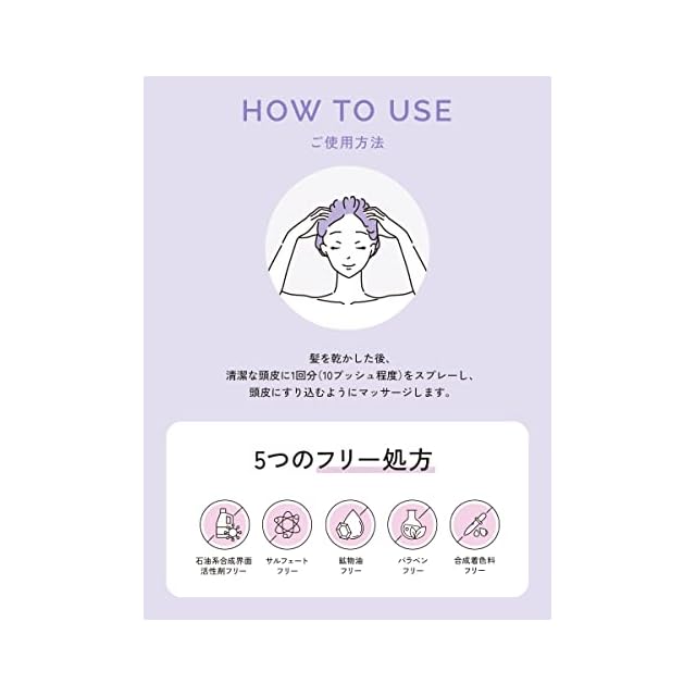 清潔な頭皮に1回分(10プッシュ程度)をスプレーし、指の腹を使って頭皮にやさしく、すりこむようにマッサージしてください。*洗髪後、髪を乾かしてからのご使用をおすすめします。*毎日ご使用いただくことをおすすめします。