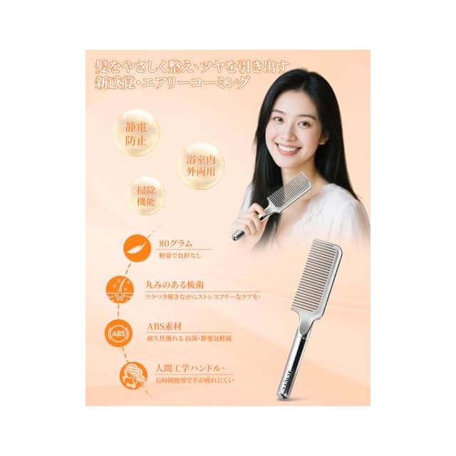 「静電気を防ぎ、さらさら髪へ」コームの表面には帯電防止加工が施されており、静電気の発生を抑えます。乾燥した季節やドライヤー使用後でも、髪の広がりやパサつきを防ぎ、指通りの良い美しい髪へと導きます。また、摩擦によるダメージも軽減し、健康的でツヤのある髪をサポートします。