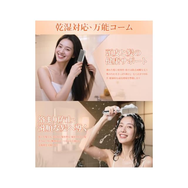 「目に見えない細やかなこだわりで髪に優しい」コームの歯は精密に設計されており、髪を傷めることなく優しく梳かすことができます。特にトリートメントやコンディショナーを使用する際には、目の粗いデザインが摩擦を最小限に抑え、キューティクルを守りながら髪を整えることが可能です。これにより、毛先のダメージを防ぎ、しなやかでツヤのある髪へと導きます。