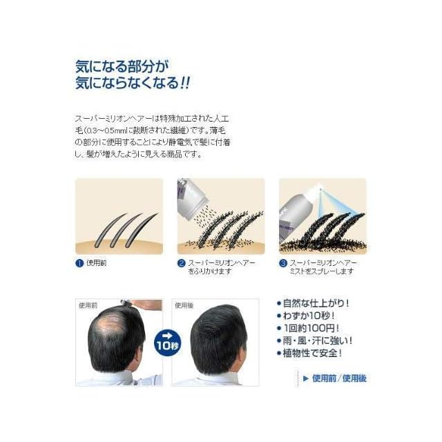 薄毛・抜け毛・円形脱毛症・白髪でお悩みの方へ! 増毛パウダー(植物系抗菌繊維)が静電気により付着して 髪を太く見せることにより、 頭頂部・後頭部・分け目・つむじ・生え際の薄毛をカバーし、 自然にボリュームアップしたように見せる商品です。 雨、風、汗からスーパーミリオンヘアーを取れにくくするため、スーパーミリオンヘアミストまたはスプレーをセットでご使用下さい。 乾いた後、くしやブラシは使用しないでください。 洗髪すれば簡単に落とせます。地肌や髪に害はなく、養毛剤との併用もできます。 男女兼用 内容量:30g 原産国:日本 全成分:植物系抗菌繊維