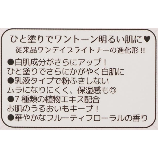 ●白肌成分がさらにアップ、ひと塗りでさらにかがやく白肌に ●SPF15配合 ●乳液タイプで粉ふきしない。ムラになりにくく、保湿感も◎ ●7種類の植物エキス配合、お肌のうるおいキープ ●華やかなフルーティーフローラルの香り