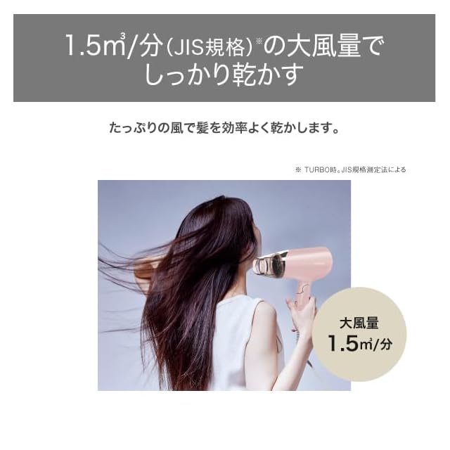 1分間に1.5m3とたっぷりの風で髪を効率よく乾かします。※1:スイッチポジション TURBO使用時 / JIS規格測定法による