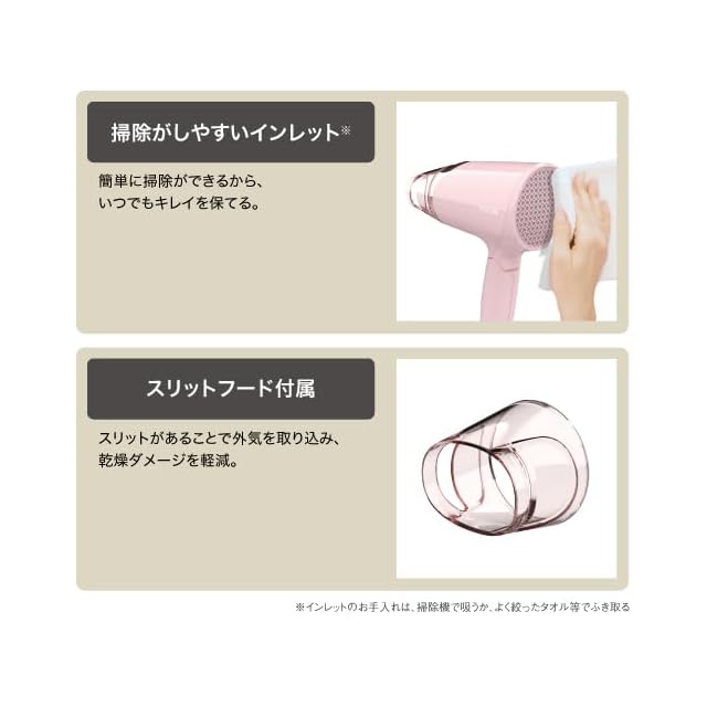 <b>【 仕様 】</b><br>■本体寸法:高さ / 215mm 幅 / 157mm 奥行 / 83mm(本体のみ)、高さ / 215mm 幅 / 203mm 奥行 / 83mm (フード付き)<br>■本体質量:395g(本体のみ)/ 410g (フード付き)<br>■消費電力:1200W<br>■電源:AC100V 50/60Hz<br>■スイッチ:切替スイッチ「TURBO/SET/COOL/OFF」<br>■折りたたみ:○<br>■風量(m3/分):1.5m3/分(TURBO時)<br>■温風温度:95℃(TURBO時)<br>■搭載イオン:マイナスイオン<br>■海外使用:×<br>■ラク抜きプラグ:×<br>■付属品:スリットフード<br>■カラー:ピンク<br>■コード長:1.7m<br>■パーツ:スリットフード(TA032867)<br>■期間:1年間<br><br><b>【 説明 】</b><br>■1分間に1.5m3とたっぷりの風で髪を効率よく乾かします。※1:スイッチポジション TURBO使用時 / JIS規格測定法による<br>■マイナスイオン※が髪全体に行き届き、髪の広がりの一因となる静電気を低減します。 ※放出イオン量 約1,000万個/cm3以上 / 当社測定法/当社比較検証法による<br>■洗髪後のドライに適した大風量の「TURBO」、優しい風で髪のセットに適した「SET」、温風で髪を整えた後の仕上げに冷風の「COOL」、の3つのモードに切り替えられます。<br>■500mlペットボトルよりも軽いので疲れにくく、どなたでも使いやすいドライヤーです。<br>■〈掃除のしやすいインレット※〉簡単に掃除ができて、いつでもキレイで清潔に。〈スリットフード付属〉スリットがあることで外気を取り込み、乾燥ダメージを軽減します。※インレットのお手入れは、掃除機で吸うか、よく絞ったタオル等で拭き取ってください。<br>■幅広い世代に人気のパステル調のピンクと柔らかなホワイトの2色展開です。<br><br><b>【商品に関するお問い合わせ】</b><br>テスコム サポートセンター<br>ご購入後TEL. 0120-343-122<br>ご購入前TEL.0120-106-018<br>受付時間 9:00~17:00 (土・日・祝日、及び会社指定の休日を除く)<br>※携帯電話・PHSからもご利用いただけます。<br>※一部つながらない場合がございます。
