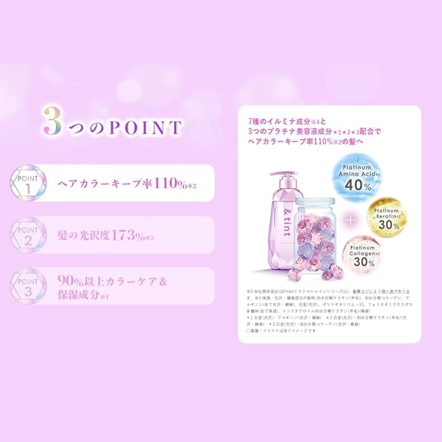 7種のイルミナ成分と3つのプラチナ美容液成分配合で、ヘアカラーキープ率110%の髪を実現