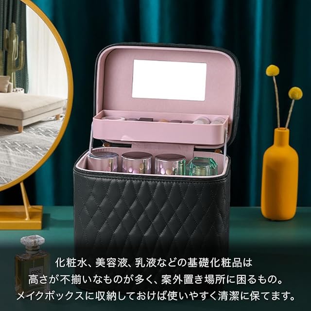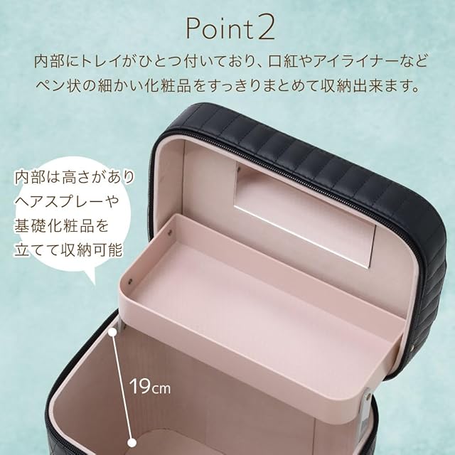 内部にトレイがひとつ付いており、コンパクトやアイライナーなど、ペン状の細かい化粧品をすっきりまとめて収納出来ます。内部の高さは19cmあるので、ヘアスプレーや基礎化粧品を立てて収納出来ます。