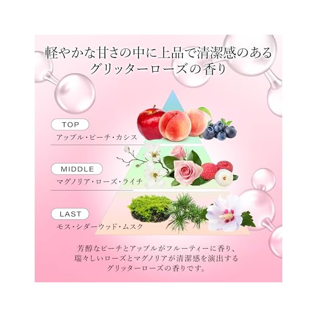 エレガントで清潔感のあるグリッターローズの香り。 ※1超高圧加工処理装置を用いた原料※2超高圧処理したイソステアロイル加水分解ケラチン(羊毛)(補修成分)
