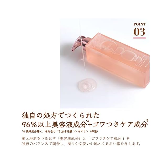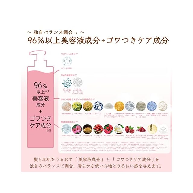 《 97%以上*美容液成分 》独自の調合でつくられた髪と地肌をうるおす「美容液成分」と水分蒸発を防ぐ「浸透オイル」を独自のバランスで調合し、滑らかな使い心地とうるおい感を与えます。(*6種の浸透保湿成分 カムカムエキス/ツボクサエキス/プラセンタエキス/ビタミンC誘導体/ビタミンA誘導体/ビタミンE) また、髪と地肌をいたわる7つ以上の無添加・フリー設計です。