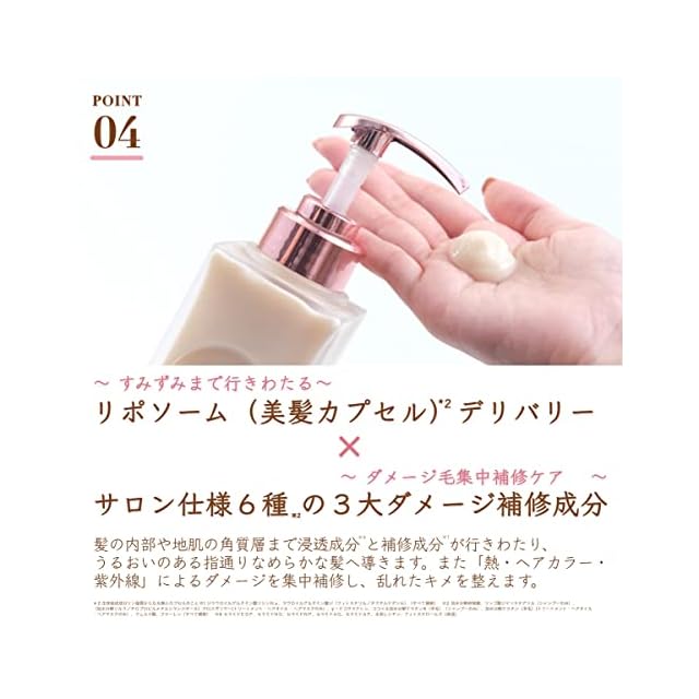 《 貯水オイル処方 》スキンケア発想「 shampoo(整える) + treatment(補う・守る) + oil(集中ケア) 」の隙なし3段階保湿ケアのアプローチで、髪と地肌に確かな保湿力とうるおいを与えます【 シャンプー 】選択式吸着機能成分ヒドロキシアパタイト配合。汚れの原因を選択的に洗浄し、必要なうるおいをキープ【 トリートメント 】キューティクルケア成分加水分解シルク*と加水分解ケラチン(羊毛)配合。なめらかな指通りの良い髪へ(*(加水分解シルク/PGプロピルメチルシランジオール)クロスポリマー)【 ヘアオイル 】サロン仕様 浸透型ダメージ補修・プロテクト成分ジラウロイルグルタミン酸リシンNa配合。傷んだ髪の内部まで浸透・集中修復し、髪を保護