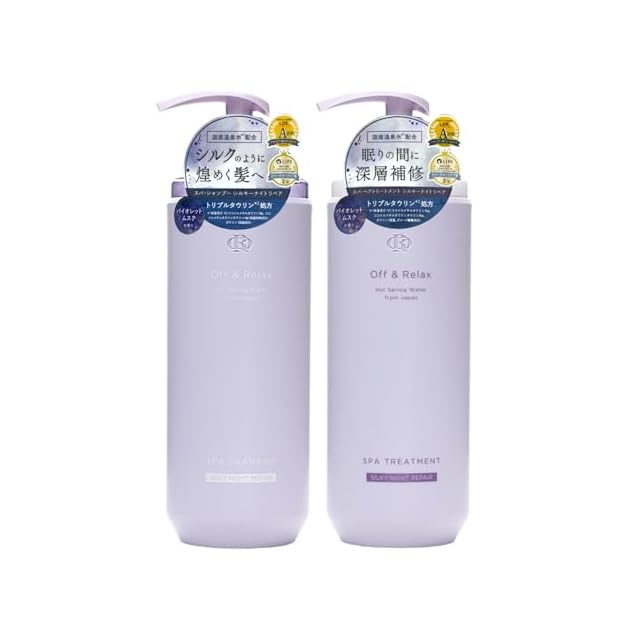 髪と地肌に、スパの恵みを『頭皮のの汚れをOff』&『頭皮を整えてRelax』<br> <br> 「ナイトケアで深層補修、シルクのように煌めく髪へ」<br> 髪のダメージケアと頭皮ケアの新バランスを提案。<br> Off&Relaxシリーズの最高峰の指通りの良い洗い上がりをお楽しみください。<br> <br> ・トリプルタウリン処方<br> 独自の処方技術でお眠りの間にも髪と頭皮にパワーチャージ<br> しっかり浸透補修し、健やかな頭皮と髪に導きます<br> <br> ・ヒートプロテクトテクノロジー<br> 熱ダメージを防いでドライヤー後も美しい髪に<br> <br> ・髪を労わる5大美容成分<br> サロン帰りのような指通りと艶めきを<br> ユズセラミド、コエンザイムQ10、トレハロース、高保湿型ヒアルロン酸、大豆タンパク<br> <br> ・厳選ボタニカルエッセンス<br> 紅藻、ブドウ、センブリ、カモミール、コメ、甘草<br> <br> 〇シルキーナイトリペアタイプ<br> 日中の紫外線、日頃のパーマやカラーリングなどで髪は深刻なダメージを。<br> ナイトケアで、髪ダメージの予防と補修をし、しなやかな指通りの髪へ導きます。<br> <br> 『Off&Relax OR スパ・シャンプー シルキーナイトリペア』<br> トリプルタウリン配合し、髪と頭皮の汚れを優しく落とし、髪にハリ・コシを与えます。<br> <br> 『Off&Relax OR スパ・ヘアトリートメント シルキーナイトリペア』<br> 独自のヒートプロテクトテクノロジーで、髪を紫外線やドライヤーなどの熱ダメージから守り、髪を労わる5大保湿成分を配合して、乾燥知らずな髪へ。<br> <br> バイオレットムスクの香り<br> フレッシュなグリーン感が特徴のバイオレットの香りにカシス、アップル、ワイルドストロベリー、アプリコットなどの瑞々しいフルーティーノートを合わせ。清潔感のあるミュゲと柔らかなムスク、サンダルウッドを重ねた明るく心躍る香り。<br>