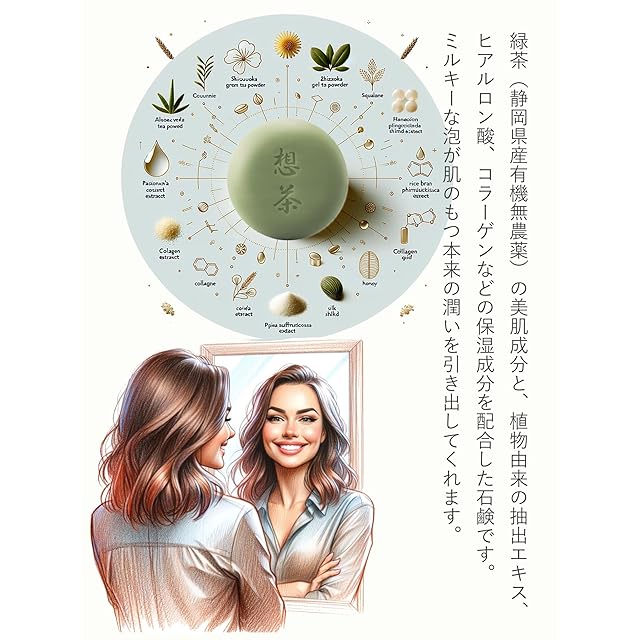 成分:石ケン素地、シリカ、アルミナ、酸化鉄、チャ葉(静岡県産緑茶粉末)、オウゴンエキス、アロエベラ葉エキス、キュウリ果汁、グリチルリチン酸2K、スクワラン、ソウハクヒエキス、ヨクイニンエキス、加水分解コラーゲン、ヒアルロン酸Na、コメヌカスフィンゴ糖脂質、水添レシチン、リゾレシチン、加水分解シルク、ハチミツ、褐藻エキス、グリセリン、水、PEG-150、BG、エタノール、銅クロロフィリンNa、カラメル、香料(茶の香り)