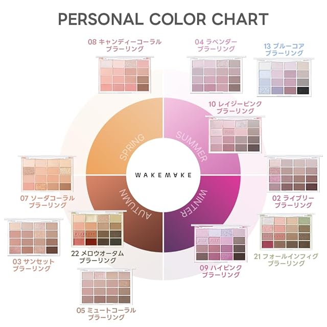 ソフトブラーリングアイパレット</br></br> 多彩なカラーと質感でなりたい自分を叶えるマルチパレット</br></br> #なりたいに応える</br> #無限の表現力</br> #毎日を彩る16色パレット</br></br></br> 1.OliveYoungNo.1*1アイパレット</br> OliveYoungを代表するアイパレット。2024年にはランキング1位*1を獲得しました。</br> また、美容ファッション誌・口コミサイトでベストコスメ受賞 6冠を達成*2。</br> デイリーに使えるカラーからポイントになるようなトレンドカラーまで、WAKEMAKEならではの、明度と彩度にこだわったカラー構成になっています。</br> 1つのパレットで様々なカラーの組み合わせができるので、普段のメイクがグッと楽しくなります。</br></br> 2.やわらかい肌当たり、ふんわり自然な発色</br> マット・シマー・マットグリッター・グリッターまで多彩なテクスチャー。</br> 粉飛びしづらくきちんとお肌に密着してくれるのに、濃くなりすぎず自然にカラーをぼかすことができます。</br> 3.毎日手に取りたくなる万能カラーラインナップ</br> メイクの度に使いたくなるような、日常にマッチする13SKU展開。</br> なりたいイメージやお肌のトーン、ファッションに合わせて楽しくお選びいただけます。</br></br> 02 ライブリーブラーリング:ほんのりやわらかさを感じるロージーブラウン</br> 03 サンセットブラーリング:多幸感あふれる優しいピンクベージュ</br> 04 ラベンダーブラーリング:透明感と血色感に惚れるラベンダーカラー</br> 05 ミュートコーラルブラーリング:あたたかみのあるまろやかなピンクブラウン</br> 07 ソーダコーラルブラーリング:温かみのある可愛らしいコーラルブラウン</br> 08 キャンディーコーラルブラーリング:パッと華やぐピンクコーラル</br> 09 ハイピンクブラーリング:エネルギーたっぷりのときめく鮮やかピンク</br> 10 レイジーピンクブラーリング:うつろげな青みピンクブラウン</br> 13 ブルーコアブラーリング:洗練された儚いアイシーブルー</br> 16 ブラックハッシュブラーリング:スモーキーブラックが滲む甘辛ピンク</br> 21 フォールインフィグブラーリング:甘いフィグピンクをプラスした透け感のあるセージグリーン</br> 22 メロウオータムブラーリング:あたたかみのあるピーチが加わった深みのあるカーキブラウン</br> 23 ミスティックラベンダーブラーリング:神秘的にきらめく上品なピンクラベンダー</br></br></br> 【このような方におすすめ】</br> ・繊細な仕上がりがお好きな方</br> ・その日の気分でメイクのスタイルを変えたい方</br> ・活用度の高いアイシャドウが欲しい方</br> ・自分に似合うアイシャドウがわからない方(アイシャドウ迷子の方)</br> ・韓国アイドルや韓国女優メイクに興味のある方</br></br> 【ご使用方法】</br> ブラシまたは指で適量をとった後、やわらかくブレンドしながらお肌にのせます。</br> ※本製品にはカルミンが入っております。</br></br> [Tips] </br> 指塗りでしっかり発色、ブラシ塗りでぽわんと繊細な発色でお使いいただけます。</br></br></br> *1 出典:OliveYoungAwardsアイシャドウ部門(集計期間:2024年1月1日~10月31日) 対象カラー(04)</br> *2 2024年8月 ~2024年12月時点まで国内の美容・ファッション誌、口コミサイトにて商品での累計受賞数 (自社調べ) </br> 美的 美容賢者が選ぶ2024年下半期韓国ベストコスメ メイクアップ部門パレットアイシャドウ編 第1位 (21)・ VOCE VOCE韓国コスメベスコス アイパレット部門1位 (02)・ Seventeen JKベストコスメ大賞2024上半期アイシャドウ大賞 1位 (18)・ VIVI 2024年下半期ViViコスメアワード アイメイク部門 1位 (18)・ LIPS ベストコスメ2024 パウダーアイシャドウ部門 (全カラー)・ 美的 【美容賢者が選ぶ年間韓国ベストコスメ】 パレットアイシャドウ編 (21) </br></br></br> [内容量]14g</br> [使用方法]指、チップまたはブラッシュで目元に丁寧に塗ります。</br> [使用時の注意事項] </br> 1.お肌に異常が生じていないかよく注意して使用してください。化粧品がお肌に合わないとき即ち次のような場合には、使用を中止してください。そのまま化粧品類の使用を続けますと、症状を悪化させることがありますので、皮膚科専門医等にご相談されることをおすすめします。(1)使用中、赤味、はれ、かゆみ、刺激、色抜け(白斑等)や黒ずみ等の異常があらわれた場合(2)使用したお肌に、直射日光があたって上記のような異常があらわれた場合</br> 2.傷やはれもの、しっしん等、異常のある部位にはお使いにならないでください。</br> 3.保管及び取り扱い上の注意事項1)乳幼児の手の届かないところに保管してください。2)極端に高温又は低温の場所、直射日光のあたる場所には保管しないでください。</br> [製造国]大韓民国</br> [製造販売元]ONEMAKE合同会社</br> [販売元]CJ Olive Young Japan株式会社</br></br>