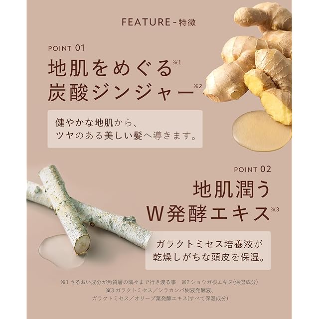 【シャンプー】「炭酸ジンジャー※1が地肌をめぐる※2 根元ふんわり、まとまりのあるツヤ髪へ」 フレッシュで温かみのあるグレープフルーツとジンジャーの香り ストレート/うねり抑える※3 地肌がスッとする使用感 [シリコン・パラベン・合成着色料・サルフェート※4フリー] ➀ 炭酸ジンジャーエキス※1配合 └健やかな地肌から、髪本来の美しさを呼び覚ます ② W発酵成分※5配合 └スキンケアで注目のガラクトミセス(酵母)で発酵させた2種の成分で、エイジングにより乾燥しがちな頭皮を保湿します。 ③環境に優しい 詰替パウチ ・環境に優しい再生プラスチック使用で石油由来原料を削減 ・本体容器よりも廃棄プラスチックを約82%削減できます ※1 ショウガ根エキス(保湿成分) ※2 うるおい成分が角質層の隅々まで行き渡る事 ※3 髪に水分を補う事による ※4 硫酸系界面活性剤 ※5 ガラクトミセス/シラカンバ樹液発酵液、ガラクトミセス/オリーブ葉発酵エキス(すべて保湿成分) 【トリートメント】 「炭酸ジンジャー※1が地肌をめぐる※2 根元ふんわり、まとまりのあるツヤ髪へ」 みずみずしく温かみのあるオレンジとジンジャーの香り ストレート/うねり抑える※3 [シリコン・パラベン・合成着色料フリー] ➀ 炭酸ジンジャーエキス※1配合 └健やかな地肌から、髪本来の美しさを呼び覚ます ② W発酵成分※4配合 └スキンケアで注目のガラクトミセス(酵母)で発酵させた2種の成分で、エイジングにより乾燥しがちな頭皮を保湿します。 ③ 地肌に直接つけることができるトリートメント(継承) └頭皮に有用成分を浸透※5 ④環境に優しい 詰替パウチ ・環境に優しい再生プラスチック使用で石油由来原料を削減 ・本体容器よりも廃棄プラスチックを約82%削減できます ※1 ショウガ根エキス(保湿成分) ※2 うるおい成分が角質層の隅々まで行き渡る事 ※3 髪に水分を補う事による ※4 ガラクトミセス/シラカンバ樹液発酵液、ガラクトミセス/オリーブ葉発酵エキス(すべて保湿成分) ※5 角質層まで