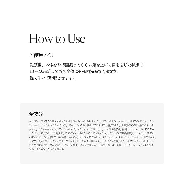 霧のようなミストで顔全体に均等に噴射されることで軽くさっぱりと仕上がりスキンケアやメイク後にもお使い頂けます。