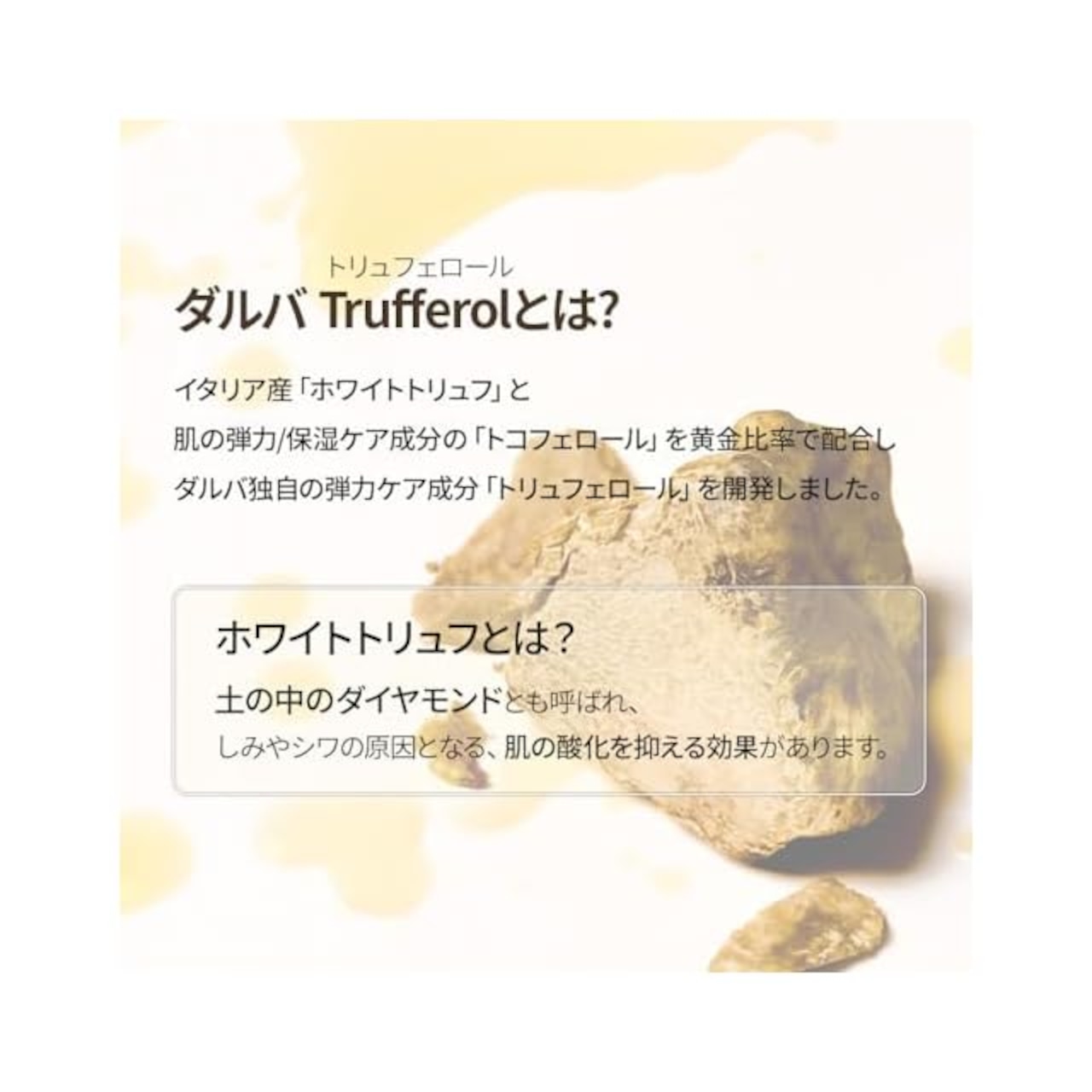 ダルバ独自の弾力ライセンス成分トリュフェロール (イタリア産ホワイトトリュフʻツベルマグナツムエキスʼ+肌の弾力と保湿をケアするʻトコフェロールʼ) でつややかでハリのある肌にケアします