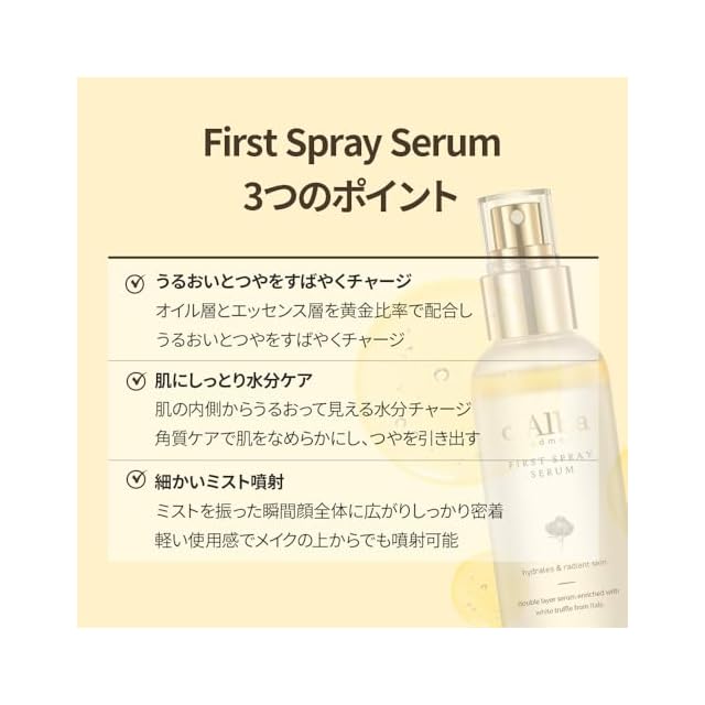 商品名:【d'Alba公式】ホワイトトリュフ ファースト スプレーセラム (100ml) ミスト化粧水 保湿ミスト 保湿セラム 潤いミスト エッセンスミスト 二層式 化粧水 敏感肌 乾燥肌 弾力 毛穴 キメ整える ノンコメド 無香料 化粧直し ヴィーガン